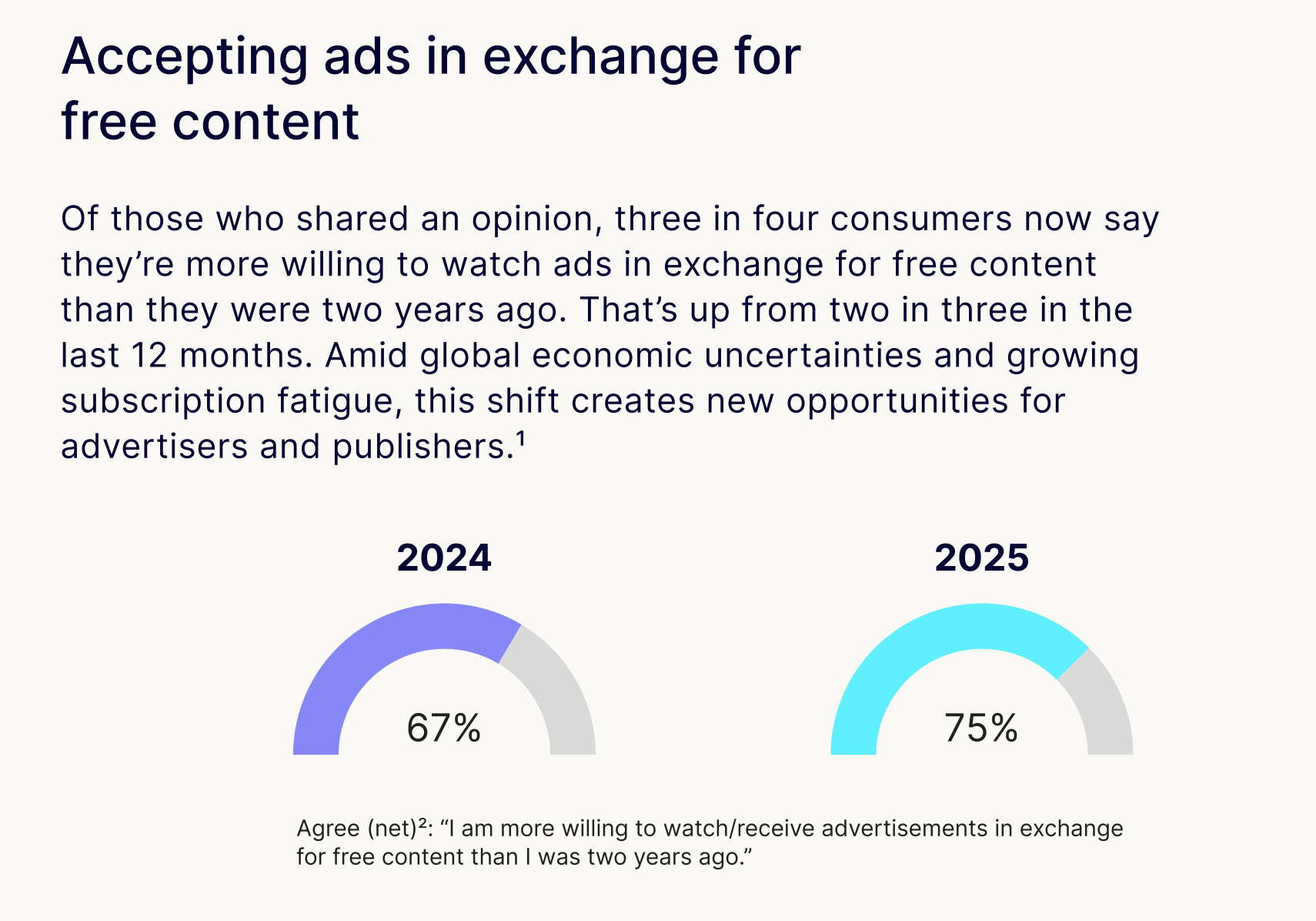 Three in four consumers now say they are more willing to watch ads in exchange for free content than they were two years ago, up from two in three in 2024. This shift reflects growing subscription fatigue and presents new opportunities for advertisers and publishers.
