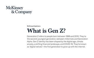 Gen Z is currently the second-youngest generation, with millennials coming before them and Generation Alpha after. Like every generation, Gen Z’s behaviors are shaped by how they grew up. Young people today have come of age in the shadow of climate doom, pandemic lockdowns, and fears of economic collapse. The earliest Gen Zers were born when the internet had just achieved widespread use. They’re called “ digital natives”—the first generation to grow up with the internet as a part of daily life. The generation spans a wide range: the oldest Gen Zers have jobs and mortgages, while the youngest are still preteens. Globally, Gen Z is growing fast: Gen Zers will make up a quarter of the population of the Asia–Pacific region by 2025. Read on to understand what makes Gen Z tick.